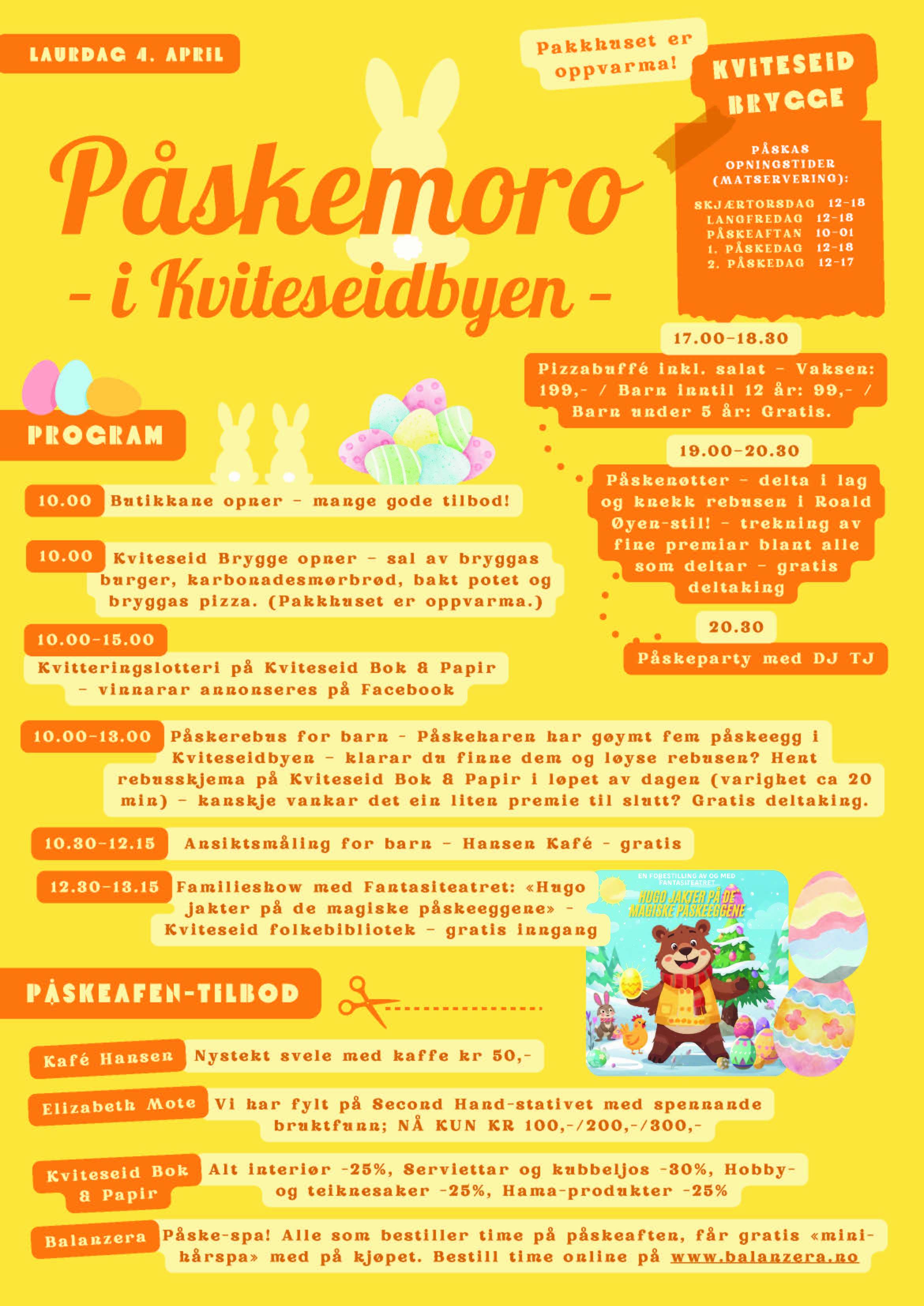 Kviteseid Brygge held ope og serverer mat gjennom dagen, og det blir også mogleg å kose seg med pizzabuffé på ettermiddagen. For dei minste blir det familieshow på biblioteket, og utover kvelden kan du bli med på påskenøttar og sosialt samvær, -før dagen rundast av med påskeparty.